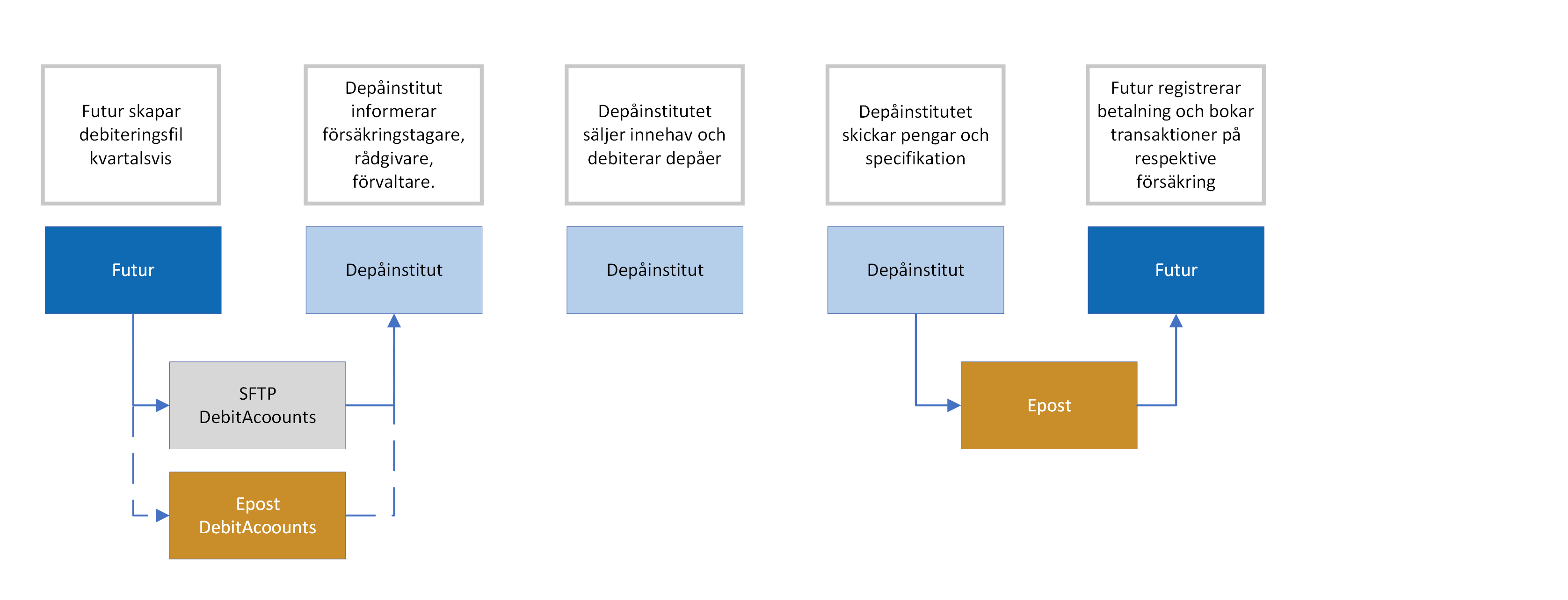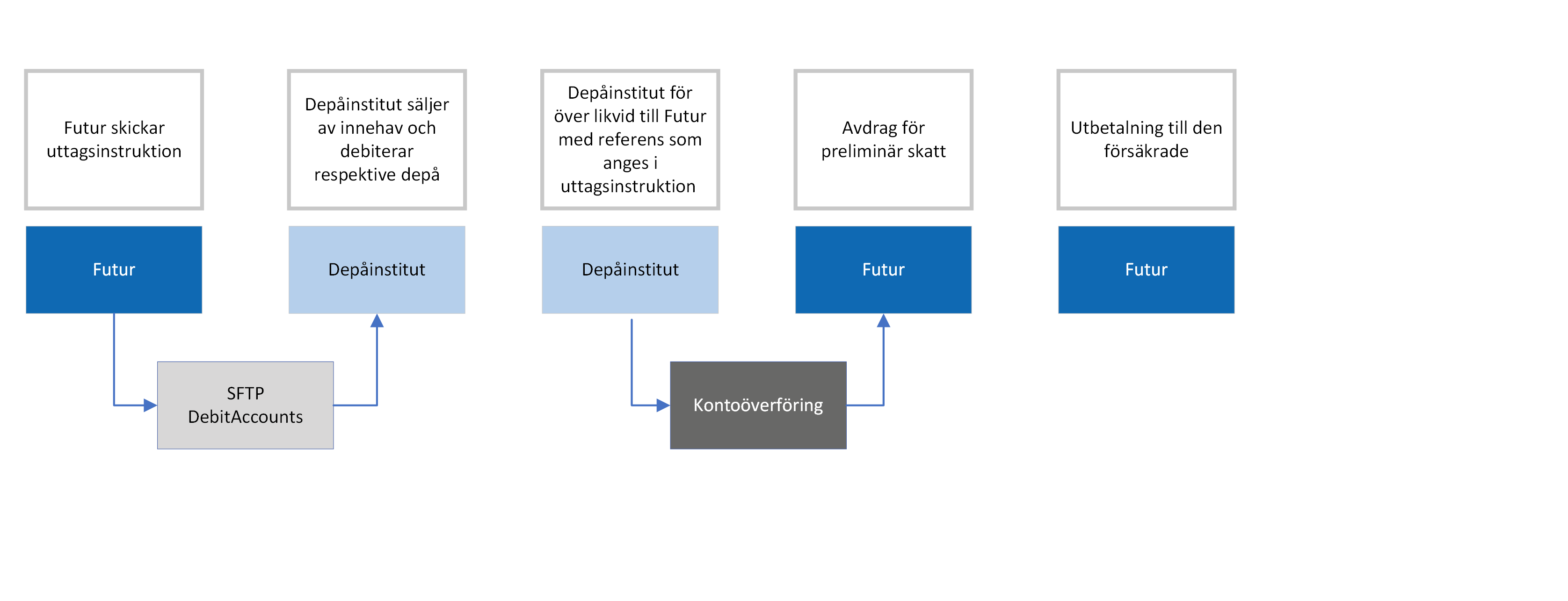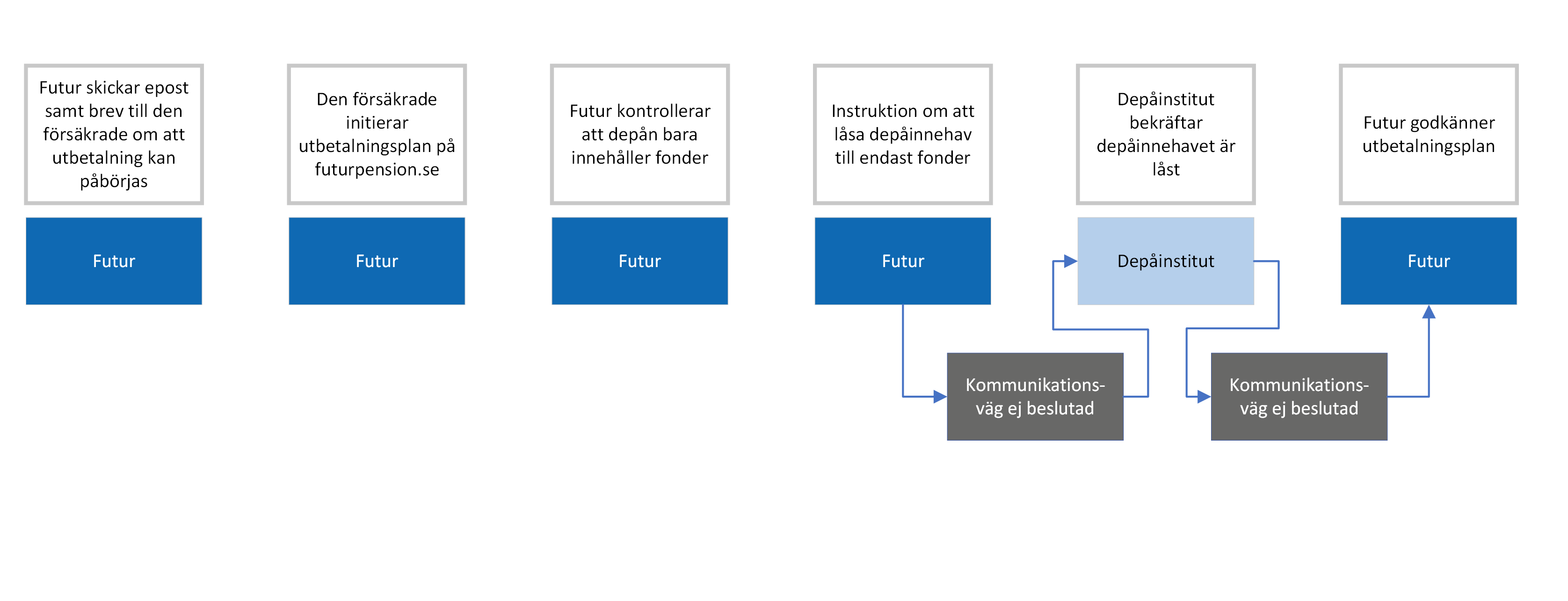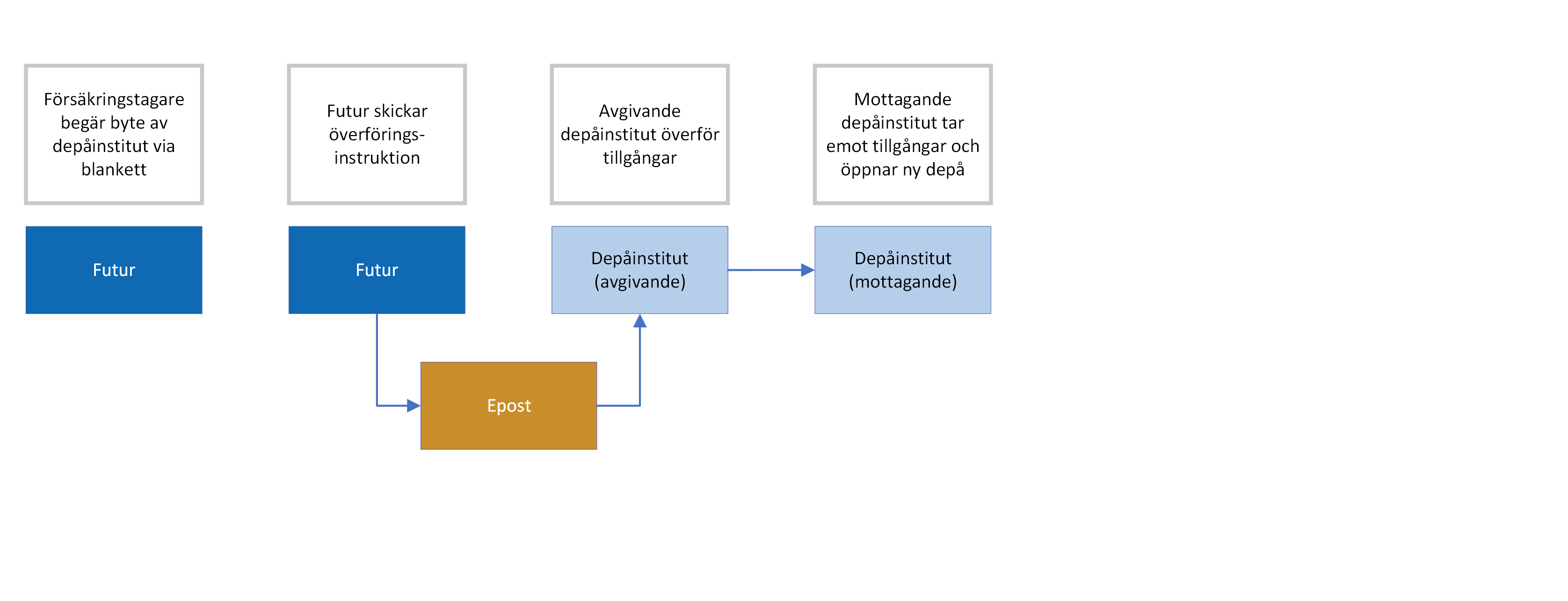 Om en försäkringstagare önskar byta depåinstitut, sker det med nedanstående process. Begäran av byte tas emot av Futur, direkt eller via försäkringsförmedlare. Avgivande depåinstitut överför tillgångar till mottagande depåinstitut som öppnar en ny depå.
