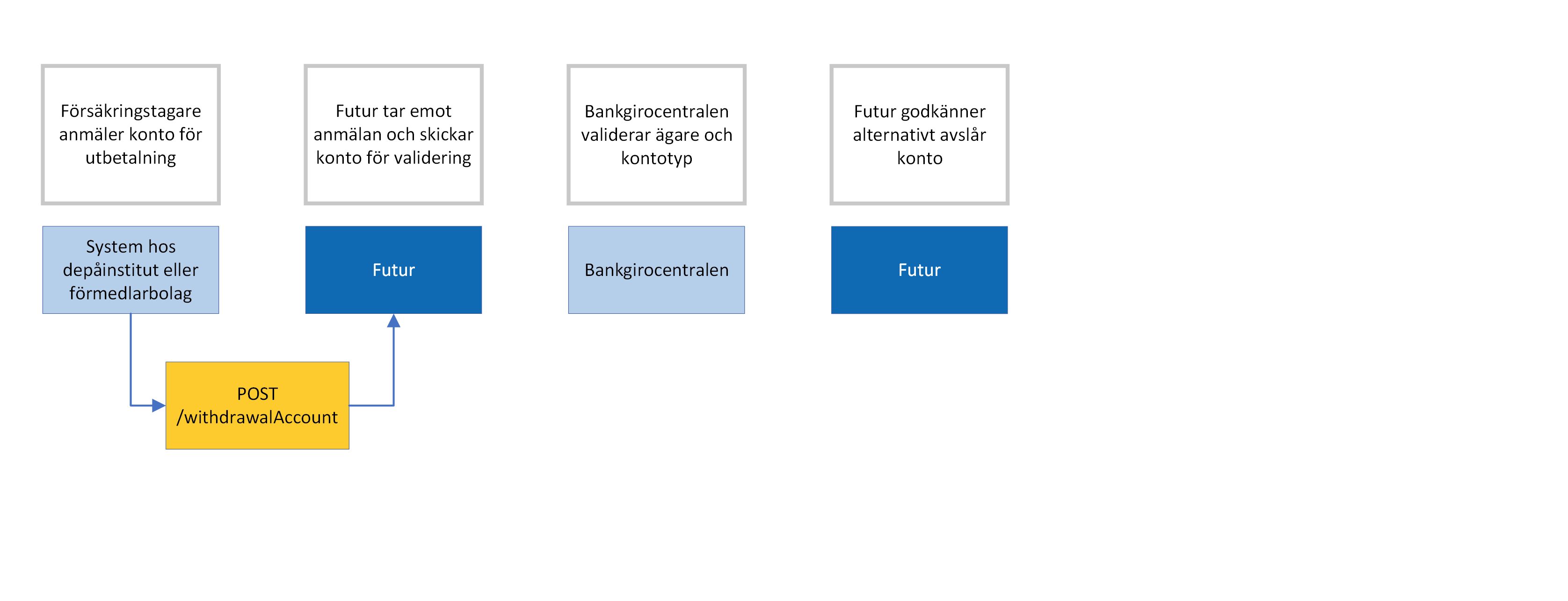 POST /Customer/{customerNumber}/WithdrawalAccount I metoden motsvarar customerNumber det kontonummer som försäkringstagaren angett. Kontonummer ska anges utan bindestreck och utan Swedbanks kontrollsiffra i clearingnummer. Konton som anmälts till Futur före klockan 07:00 hinner valideras till cirka klockan 13:00 samma dag.