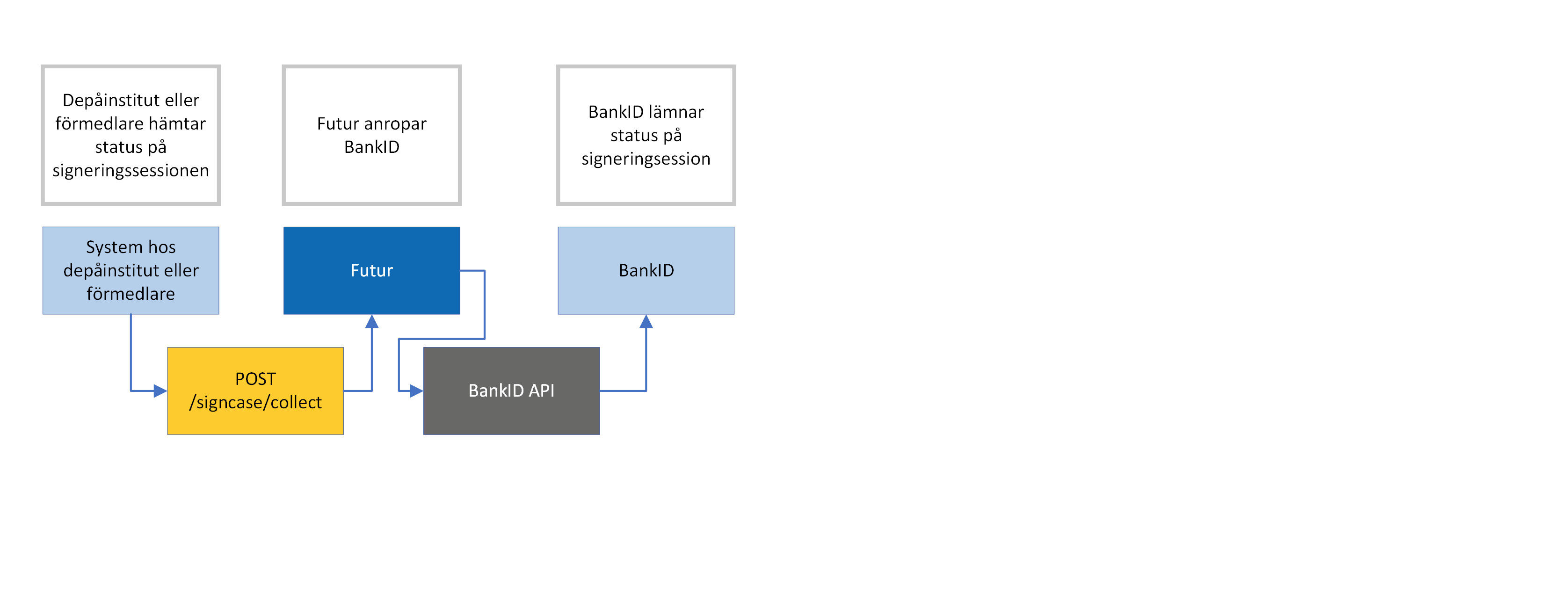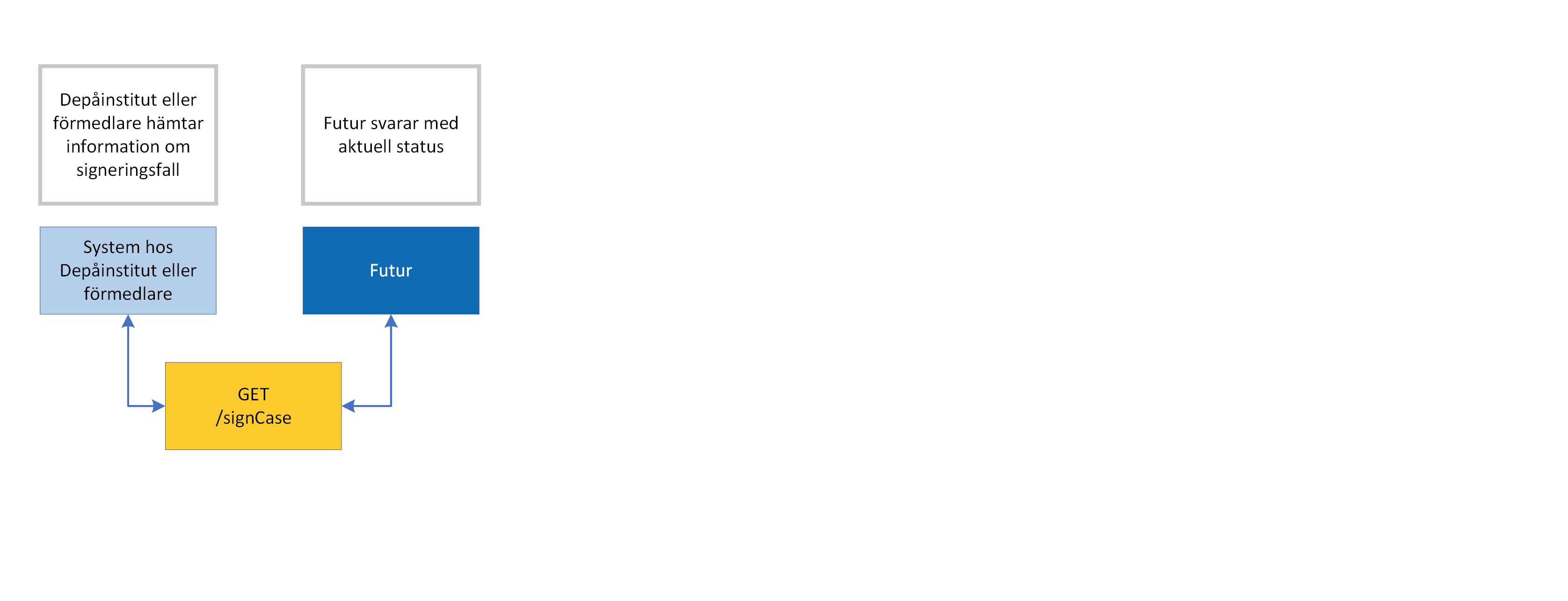 GET /SignCase/{id}Metoden returnerar en lista över potentiella signatärer samt deras respektive roller. Om signerings ska ske via ett annat gränssnitt än Futurs, så går det som ovan att hämta status på sign-fallet via GET Signcase.